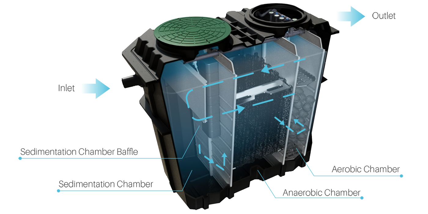 Easily connects after existing septic tanks to upgrade treatment performance without replacing the original system.